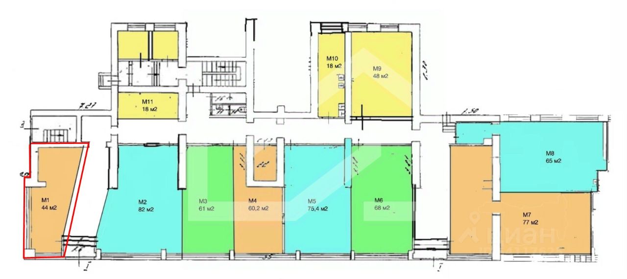 1166929. Предлагаем помещение свободного назначения во встроенно-пристроенной части, площадью 44 кв. м, расположенное на первом этаже 9-этажного жилого дома. Без комиссии для покупателя.