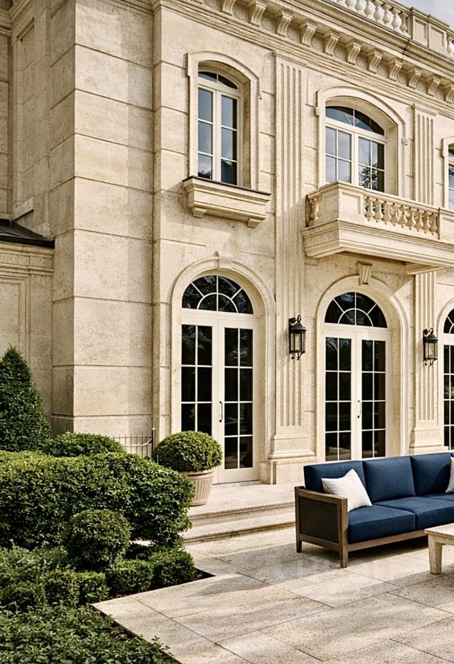 На огороженной территории перед особняком наземная гостевая парковка.