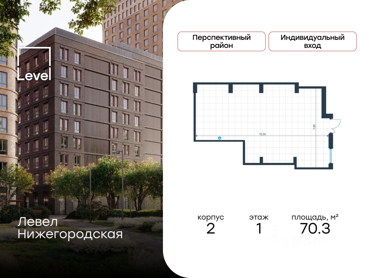 Продаётся помещение свободного назначения площадью 70.3 кв. м. в новостройке Левел Нижегородская по адресу Москва, ЮВАО, Нижегородский, Перовское шоссе, д. 21, корп. 2. Помещение со свободной планировкой. Окна с видом во двор. Высота потолков 4.80 м. Отдельный вход со двора. Стоимость помещения — 41 382 523 руб. Способы оплаты и более подробная информация по телефону.