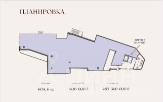 Площадь помещения — 604,2 м². Пространство светлое, с большими окнами и гибкой планировкой: служебные и технические зоны можно грамотно разместить в нишах, сохранив основную полезную площадь для клиентов и гостей.