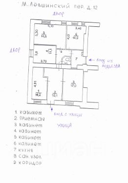 Функциональная планировка: приемная, 5 кабинетов, кухня, 1 санузел, коридор.