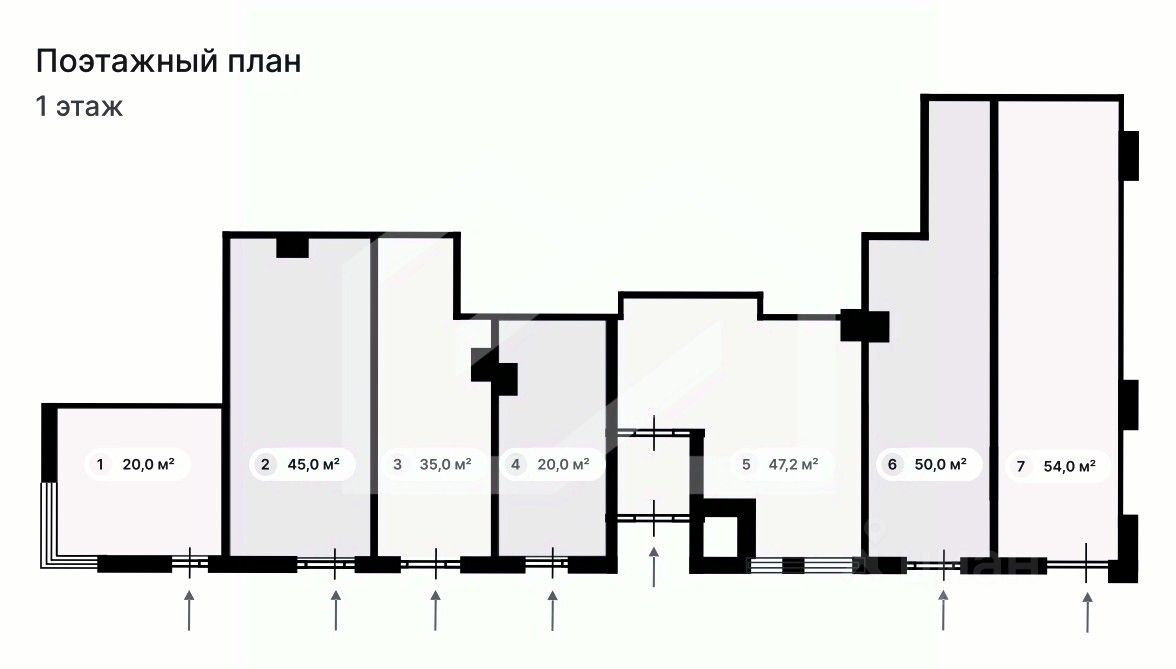 1163424. Предлагаем помещение свободного назначения, площадью 45 кв. м., расположенное на первом этаже 26-этажного жилого дома. Без комиссии для покупателя.