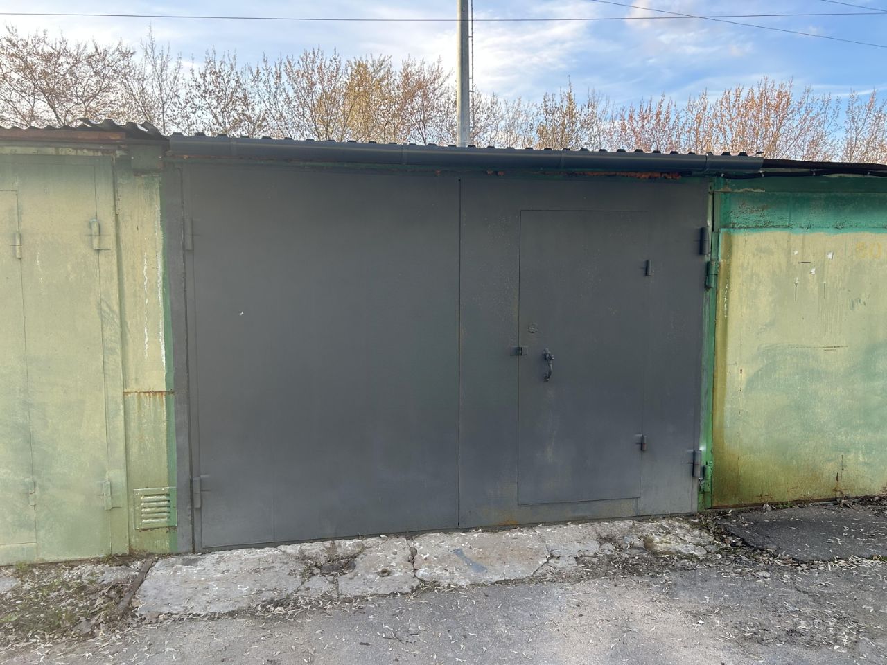 Железный гараж с охраной, электричеством. В дожди не протекает, сухой. Площадь 18 м² (6:3). Свободно заезжает джип!