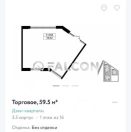 Продажа торгового помещения площадью 59,5м², расположенного в стилобатной части жилого 16 этажного дома в ЖК "Дзен-кварталы". Корпус 3.5.
