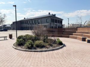 Отделка фасадов выполнена панелями с имитацией клинкерного кирпича. Дополнительно на территории организованы зоны отдыха, имеется возможность для организации летних веранд и кафе.