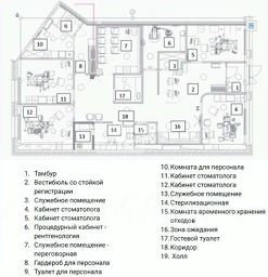 4 процедурных кабинета, 2 санузла (гостевой и для персонала с душевой), рентген-кабинет, стерилизационная, компрессорная, 2 зоны ожидания, кухня, комната персонала.