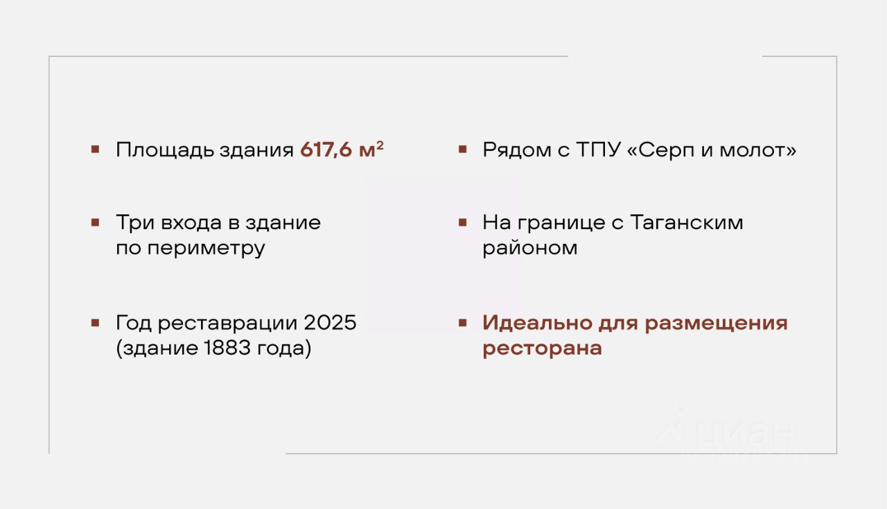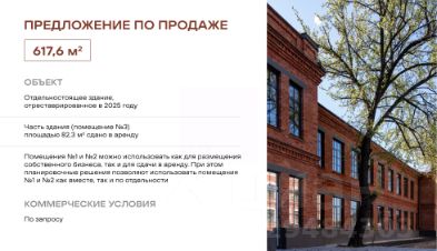 Двухэтажное здание с центральным парадным и отдельным техническим станет идеальным решением для размещения ресторана или представительского офиса. Вы также сможете разместить здесь: