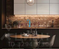 Кухня пространство с кухонным оборудованием, удобным место для приема пищи и холодильником с готовой едой