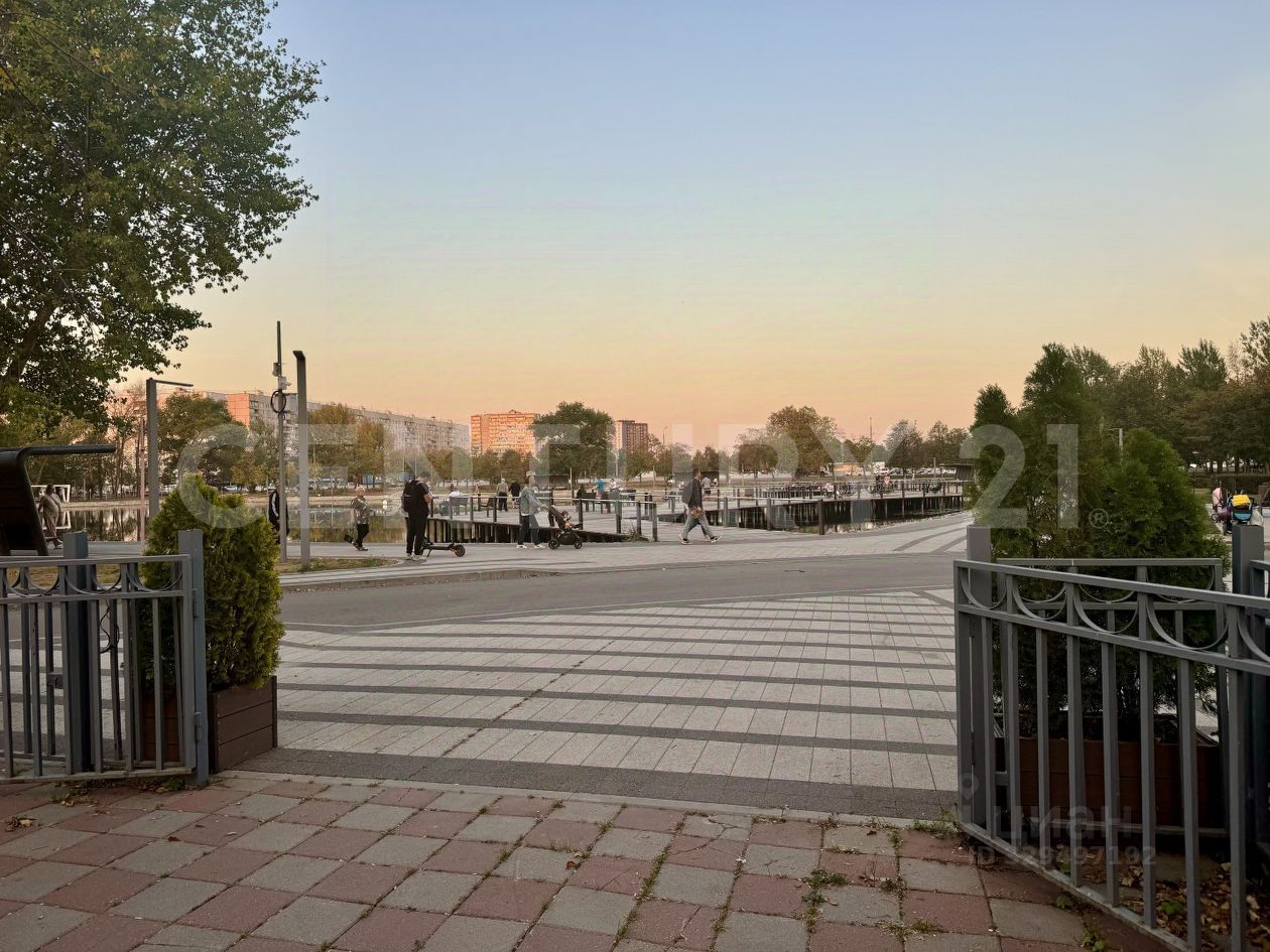 Отдельно стоящее кирпичное здание у благоустроенной набережной пруда и парка.