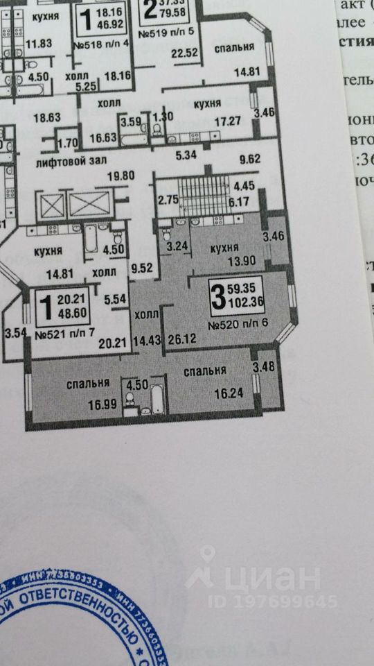Общая площадь: 102.3 м. Площадь комнат: 17, 16.3, 26.2 м. Площадь кухни 14 м. и может быть увеличена до 20 м за счёт присоединения гостевого санузла и части коридора. Имеются также и 2 лоджии с выходом из кухни и из спальни