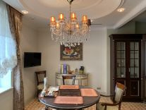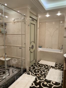 Предлагаю элегантную, комфортную квартиру в лучшем малоэтажном СЕДЬМОМ корпусе в ЖК "Воробьёвы горы". Высокие потолки и панорамное остекление придают дополнительный объем квартире. Качественный, дорогой, свежий ремонт и весь интерьер выдержаны в едином классическом стиле с элементами Ar Deco. Квартира отличается функциональной планировкой: просторный холл с гардеробной комнатой, гостевой санузел, роскошная гостиная с эркером, панорамными окнами на Мосфильмовский пруд, из кухни выход в изолированную кухню-столовую оборудованную встроенной техникой (Miele и Liebherr), мастер-спальня со своим большим санузлом и гардеробной, кабинет, детская/гостевая спальня со своим санузлом, большой хоз-блок с постирочной. Квартира находится на 7 уровне этажности, очень тихо. Квартира полностью меблирована и декорирована предметами интерьера: Adamo Busnelli, Francesco Molon, Cantiero, BM Style. Паркет из бамбука и тика. Установлены дубовые окна. Во всех санузлах мрамор и тёплый пол. Сантехника VilleroyBoch. В квартире приточно-вытяжная система вентиляции и кондиционирования, дополнительно установлены сплит-системы Daikin в каждой спальне. Есть система видеонаблюдения, охранная и пожарная сигнализация. Красивые виды из всех окон квартиры на Парк Победы, Мосфильмовский пруд, посольство Болгарии. ЖК "Воробьевы горы" расположен на самой высокой точке города, с лучшей "розой ветров" в городе. Рядом огромная парковая зона, набережная пруда. На огороженной строго охраняемой территории комплекса есть все необходимое для комфортной жизни: детские и спортивные площадки, спортивный клуб с бассейном, салоны красоты и СПА, мини-маркет, службы быта, авто-мойки. За квартирой закреплены ДВА удобно расположенных машиноместа в подземном паркинге. Оперативно организуем показ в удобное для вас время.