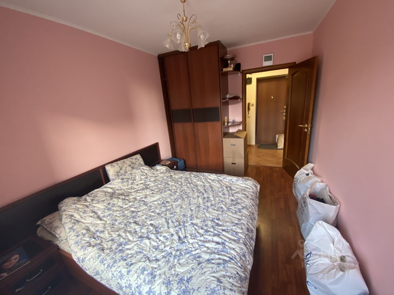Спальня: пол-паркетная доска; широкая кровать с тумбочками; глубокий шкаф-купе до потолка.