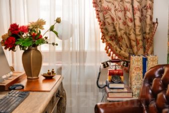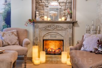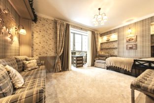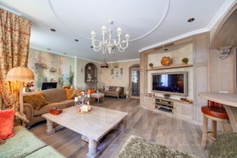 Качественная дорогая отделка: полы из массива дуба; двери массив дуба, проект которых делали на заказ; витражи раздвижных дверей по индивидуальному чертежу дизайнера; электрокамин; итальянские обои, керамогранит премиум-класса.