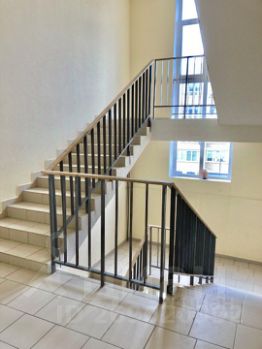 Окна выходят во двор - на детскую площадку. В подъезде просторные два входа, широкие и светлые лестничные пролеты и холлы с установленным пандусом на 1-м этаже.