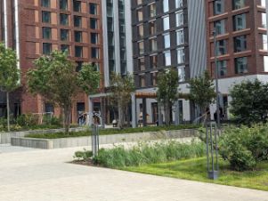 Дворы закрыты от автомобилей и случайных прохожих. Для автовладельцев предусмотрен подземный паркинг на 710 мест. Территория комплекса благоустроена: собственная набережная, прогулочная зона, зеленый двор. На первых этажах зданий разместятся кафе, салон красоты, аптека, магазины.
