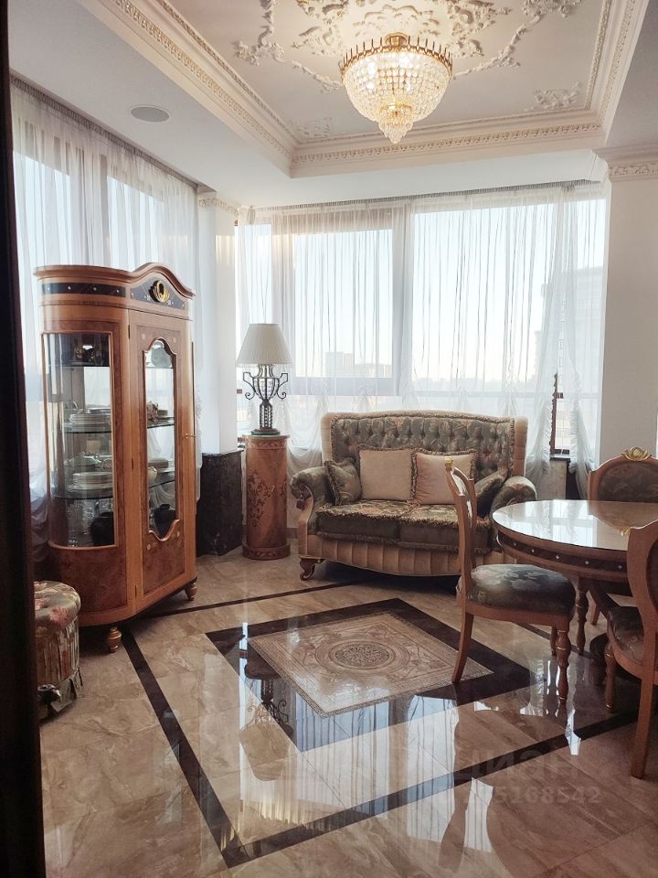 Продается пентхаус общей площадью 372,0 м.кв. по адресу: г. Москва, Измайловский бульвар, д. 58. Дом бизнес класса, консьерж, двухуровневый паркинг, въезд на территорию дома огорожен шлагбаумами. Квартира двухэтажная, оформлена в классическом стиле, выполнен качественный ремонт, имеется система индивидуального кондиционирования. Квартира продается с мебелью и бытовой техникой. На первом этаже квартиры расположены: просторный холл, гостиная, кухня-столовая, зал, две спальни, санузел, большая лоджия охватывающая две спальни и зал. На втором этаже квартиры размещены: кабинет-спальня с санузлом и выходом на просторную террасу, круглая спальня с гардеробной комнатой и санузлом с джакузи. В квартире имеется: индивидуальный лифт, перемещающийся внутри квартиры с 19 по 21 этаж, три санузла, сауна, два камина, много подсобных помещений. Один взрослый собственник, в собственности более 10 лет, никто не зарегистрирован.