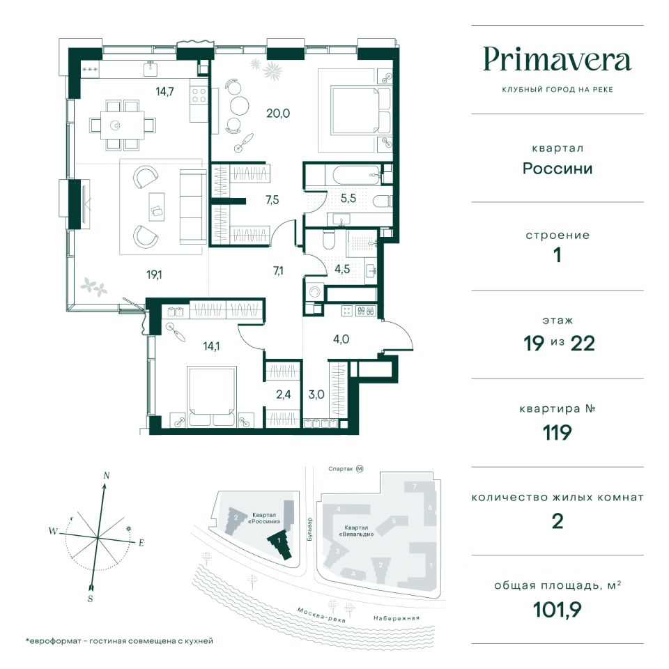 Клубный город на реке Primavera — это респектабельный проект премиум-класса на первой береговой линии Москвы-реки в экологически безупречном районе — Покровское-Стрешнево. Под панорамными окнами квартир расположился собственный экопарк, площадью 12 гектаров с сетью прогулочных дорожек, оборудованный детскими и спортивными площадками, а за ним набережная с собственным пляжем и зонами отдыха. Клубный город на реке Primavera предлагает впечатляющий выбор планировок для любого жизненного сценария: от просторных однокомнатных квартир до пентхаусов и квартир с видовыми террасами или патио. Выбирайте из 120 вариантов эргономичных планировок стандартного и евроформата. В проекте доступны квартиры площадью от 40 до 209 м², в каждой из которых открываются непревзойденные виды на реку, а угол обзора составляет 270 градусов. Из дизайнерских лобби открывается панорамный обзор на зеленый благоустроенный двор. Статусное мебелирование, потолки высотой 6 м и комфортная лаунж-зона отсылают к стилистике высококлассных пятизвездочных отелей. В Primavera есть все, что может предложить мегаполис, здесь все сосредоточено вокруг вас и настроено на ваши желания: - Всестороннее детское развитие в паре шагов от дома: 4 школы, 8 детских садов, развивающие центры с кружками и секциями. - Комфорт мегаполиса на расстоянии приятной прогулки: супермаркеты, кафе, рестораны с верандами на крыше, салоны красоты, аптеки, компании сферы услуг, многофункциональный центр для шоппинга и развлечений. - Умный дом: автоматизированное бесконтактное управление основными системами доступа, инфраструктуры и безопасности через мобильное приложение и специальные метки. Клубный город на реке Primavera выгодно отличается близостью к природе, совмещенной с насыщенной инфраструктурой.