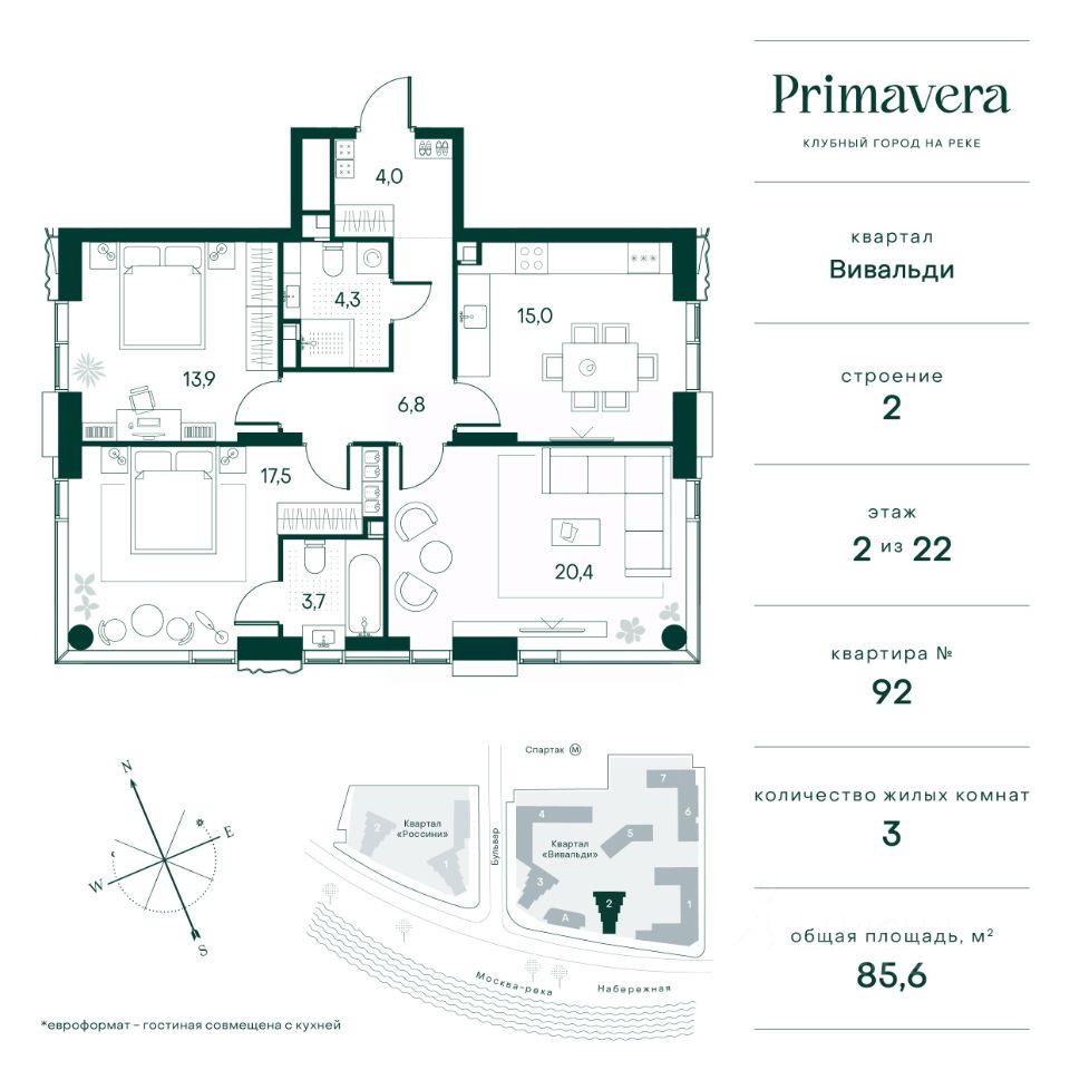 Клубный город на реке Primavera — это респектабельный проект премиум-класса на первой береговой линии Москвы-реки в экологически безупречном районе — Покровское-Стрешнево. Под панорамными окнами квартир расположился собственный экопарк, площадью 12 гектаров с сетью прогулочных дорожек, оборудованный детскими и спортивными площадками, а за ним набережная с собственным пляжем и зонами отдыха. Клубный город на реке Primavera предлагает впечатляющий выбор планировок для любого жизненного сценария: от просторных однокомнатных квартир до пентхаусов и квартир с видовыми террасами или патио. Выбирайте из 120 вариантов эргономичных планировок стандартного и евроформата. В проекте доступны квартиры площадью от 40 до 209 м², в каждой из которых открываются непревзойденные виды на реку, а угол обзора составляет 270 градусов. Из дизайнерских лобби открывается панорамный обзор на зеленый благоустроенный двор. Статусное мебелирование, потолки высотой 6 м и комфортная лаунж-зона отсылают к стилистике высококлассных пятизвездочных отелей. В Primavera есть все, что может предложить мегаполис, здесь все сосредоточено вокруг вас и настроено на ваши желания: - Всестороннее детское развитие в паре шагов от дома: 4 школы, 8 детских садов, развивающие центры с кружками и секциями. - Комфорт мегаполиса на расстоянии приятной прогулки: супермаркеты, кафе, рестораны с верандами на крыше, салоны красоты, аптеки, компании сферы услуг, многофункциональный центр для шоппинга и развлечений. - Умный дом: автоматизированное бесконтактное управление основными системами доступа, инфраструктуры и безопасности через мобильное приложение и специальные метки. Клубный город на реке Primavera выгодно отличается близостью к природе, совмещенной с насыщенной инфраструктурой.
