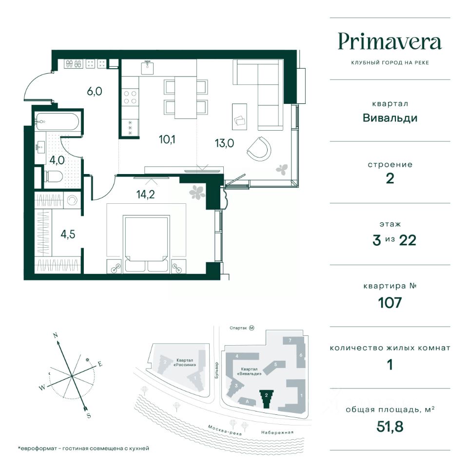Клубный город на реке Primavera — это современный жилой комплекс премиум-класса, расположенный на первой береговой линии Москвы-реки в экологически чистом районе Покровское-Стрешнево. Под панорамными окнами квартир находится собственный экопарк с продуманной сетью прогулочных дорожек и современными детскими и спортивными площадками. За парком расположена набережная с собственным пляжем и зонами для отдыха. Клубный город на реке Primavera предлагает широкий выбор планировок для различных жизненных сценариев: от просторных однокомнатных квартир до пентхаусов и жилых помещений с террасами и патио. Выберите из 120 вариантов эргономичных планировок стандартного и евроформата. Из каждой квартиры открываются красивые виды на реку с углом обзора в 270 градусов. Дизайнерские лобби предлагают панорамный обзор на благоустроенный двор. Высокие потолки в 6 метров и качественная отделка создают атмосферу, схожую с пятизвездочными отелями. В Primavera есть всё необходимое для комфортной жизни в мегаполисе: • Образование для детей в шаговой доступности: 4 школы, 8 детских садов и развивающие центры с кружками и секциями. • Удобства на расстоянии приятной прогулки: супермаркеты, кафе, рестораны с верандами, салоны красоты, аптеки и многофункциональный центр для шоппинга и развлечений. • Умный дом: автоматизированное бесконтактное управление основными системами доступа и безопасности через мобильное приложение. Клубный город на реке Primavera выгодно сочетает комфорт городской жизни с близостью к природе. Живите в месте, где все создано для вашего удобства!