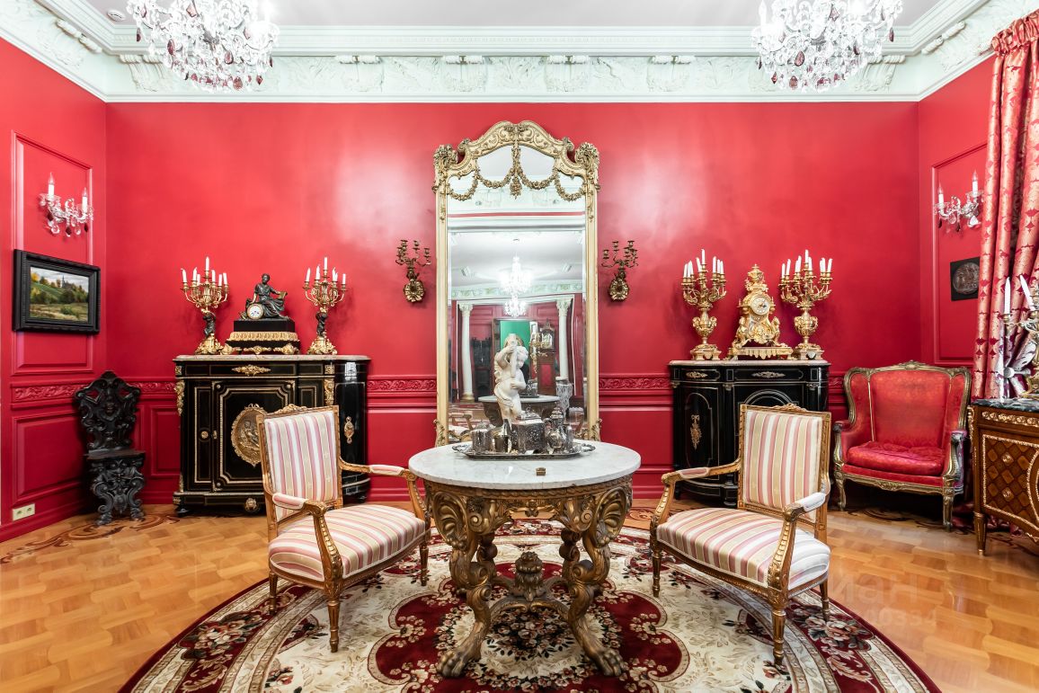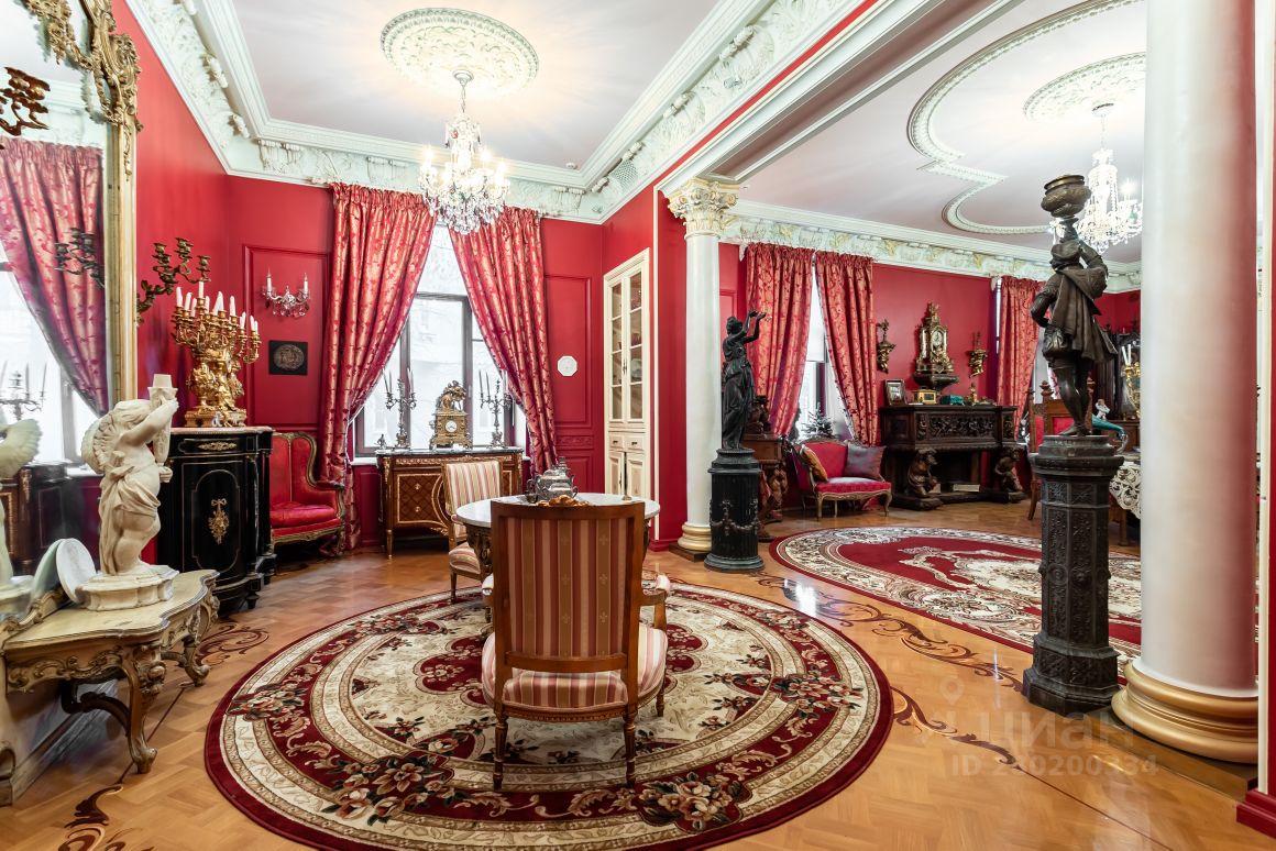Высококачественный ремонт и решения интерьеров выполнены в стиле дворцового Ампира. Потолок высотой 3,8 метра украшен лепниной необыкновенной красоты. Окна, двери, встроенные шкафы и другие изделия заказаны по специальному проекту из ценных пород дерева. Полы из натурального мрамора с инкрустацией и фигурного паркета. Планировка в настоящий момент предполагает 3 спальных комнаты с гардеробными и санузлами, кабинет 24,6 м², просторную гостиную с действующим камином, разделённую колоннами на два зала 63,8 и 24 м², столовая с камином 49,5 м² и кухня 21,5 м². Также в квартире есть постирочная комната 12,5 м² и другие помещения вспомогательного назначения. Из кухни есть запасной выход (чёрный ход), который ведёт к своей кладовой и во двор.