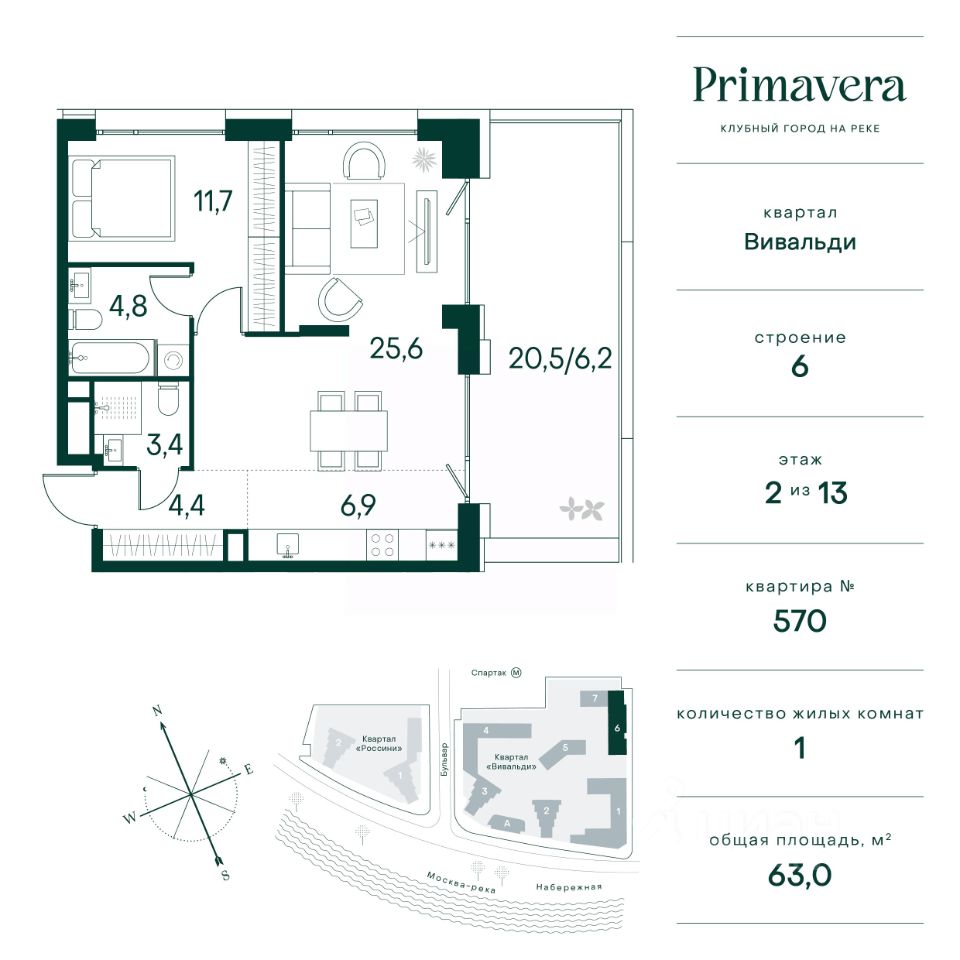 Клубный город на реке Primavera — это современный жилой комплекс премиум-класса, расположенный на первой береговой линии Москвы-реки в экологически чистом районе Покровское-Стрешнево. Под панорамными окнами квартир находится собственный экопарк с продуманной сетью прогулочных дорожек и современными детскими и спортивными площадками. За парком расположена набережная с собственным пляжем и зонами для отдыха. Клубный город на реке Primavera предлагает широкий выбор планировок для различных жизненных сценариев: от просторных однокомнатных квартир до пентхаусов и жилых помещений с террасами и патио. Выберите из 120 вариантов эргономичных планировок стандартного и евроформата. Из каждой квартиры открываются красивые виды на реку с углом обзора в 270 градусов. Дизайнерские лобби предлагают панорамный обзор на благоустроенный двор. Высокие потолки в 6 метров и качественная отделка создают атмосферу, схожую с пятизвездочными отелями. В Primavera есть всё необходимое для комфортной жизни в мегаполисе: • Образование для детей в шаговой доступности: 4 школы, 8 детских садов и развивающие центры с кружками и секциями. • Удобства на расстоянии приятной прогулки: супермаркеты, кафе, рестораны с верандами, салоны красоты, аптеки и многофункциональный центр для шоппинга и развлечений. • Умный дом: автоматизированное бесконтактное управление основными системами доступа и безопасности через мобильное приложение. Клубный город на реке Primavera выгодно сочетает комфорт городской жизни с близостью к природе. Живите в месте, где все создано для вашего удобства!