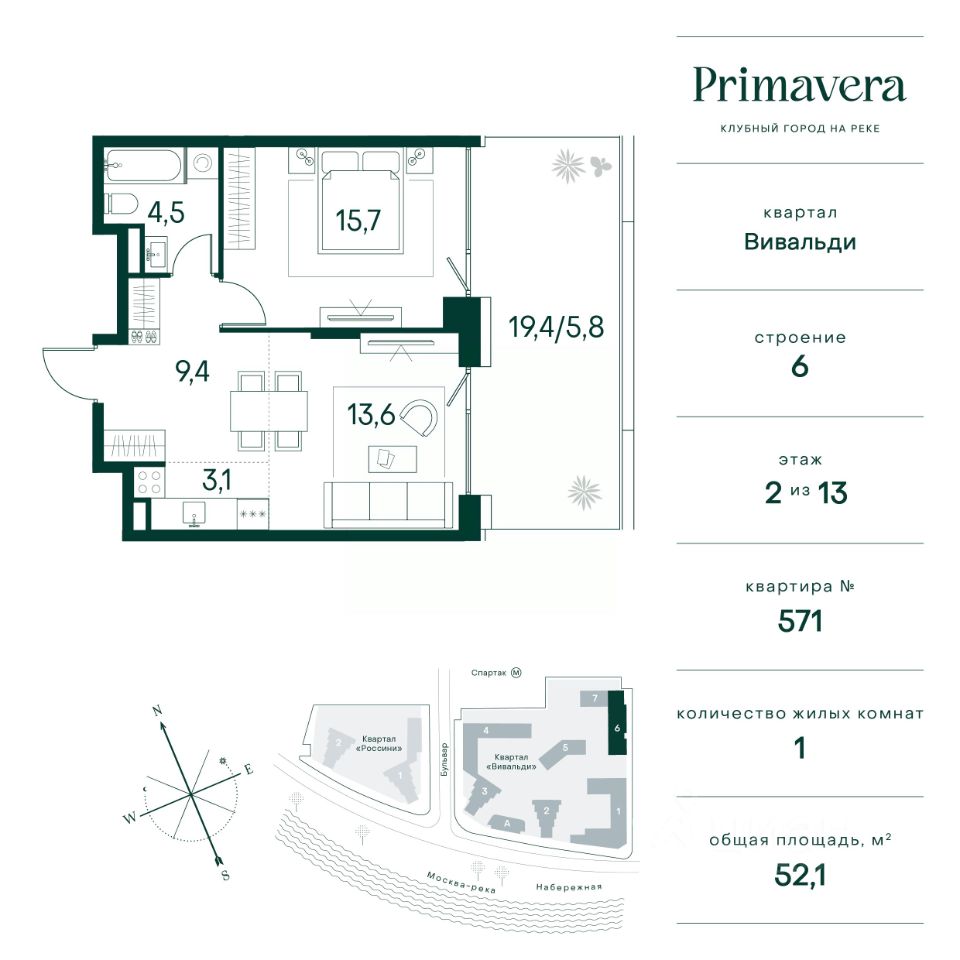 Клубный город на реке Primavera — это современный жилой комплекс премиум-класса, расположенный на первой береговой линии Москвы-реки в экологически чистом районе Покровское-Стрешнево. Под панорамными окнами квартир находится собственный экопарк с продуманной сетью прогулочных дорожек и современными детскими и спортивными площадками. За парком расположена набережная с собственным пляжем и зонами для отдыха. Клубный город на реке Primavera предлагает широкий выбор планировок для различных жизненных сценариев: от просторных однокомнатных квартир до пентхаусов и жилых помещений с террасами и патио. Выберите из 120 вариантов эргономичных планировок стандартного и евроформата. Из каждой квартиры открываются красивые виды на реку с углом обзора в 270 градусов. Дизайнерские лобби предлагают панорамный обзор на благоустроенный двор. Высокие потолки в 6 метров и качественная отделка создают атмосферу, схожую с пятизвездочными отелями. В Primavera есть всё необходимое для комфортной жизни в мегаполисе: • Образование для детей в шаговой доступности: 4 школы, 8 детских садов и развивающие центры с кружками и секциями. • Удобства на расстоянии приятной прогулки: супермаркеты, кафе, рестораны с верандами, салоны красоты, аптеки и многофункциональный центр для шоппинга и развлечений. • Умный дом: автоматизированное бесконтактное управление основными системами доступа и безопасности через мобильное приложение. Клубный город на реке Primavera выгодно сочетает комфорт городской жизни с близостью к природе. Живите в месте, где все создано для вашего удобства!