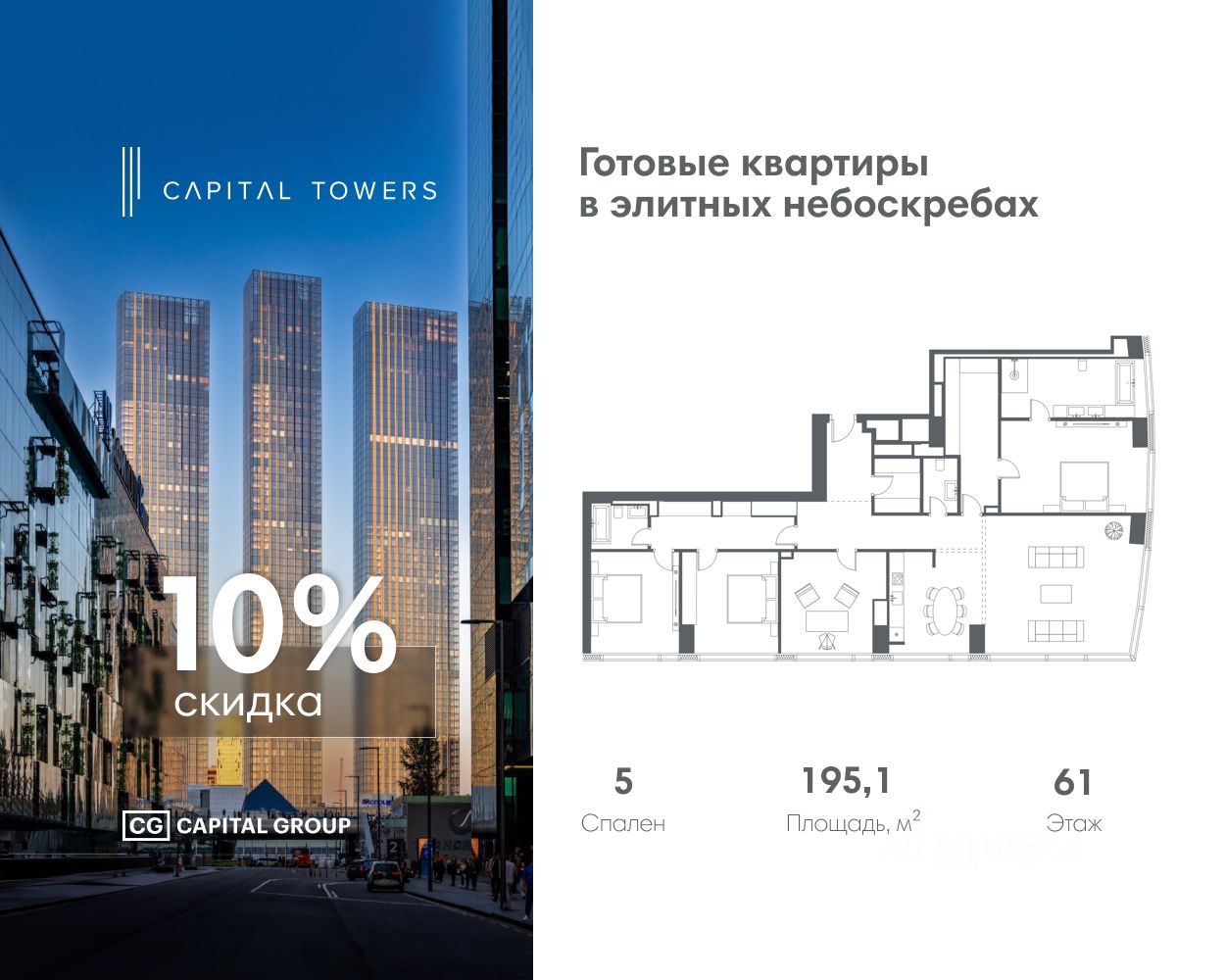 Capital Towers — это три современных жилых небоскрёба у Москва-Сити на берегу реки. Высота каждой башни — почти 300 метров, из окон открываются панорамные виды на центр Москвы, Москва-Сити, Лужники, МГУ и парк "Красная Пресня"