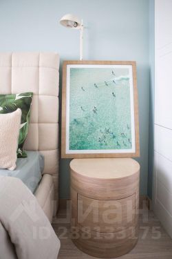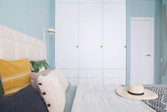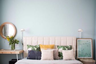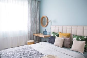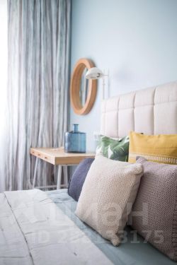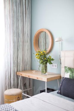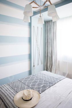 Спальня стала отдельным мирком спокойствия и умиротворения благодаря морской цветовой гамме. Мы хотели, чтобы она навевала воспоминания о лете, море и отдыхе.