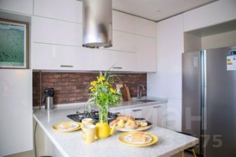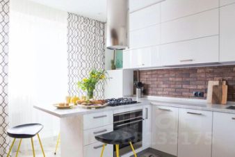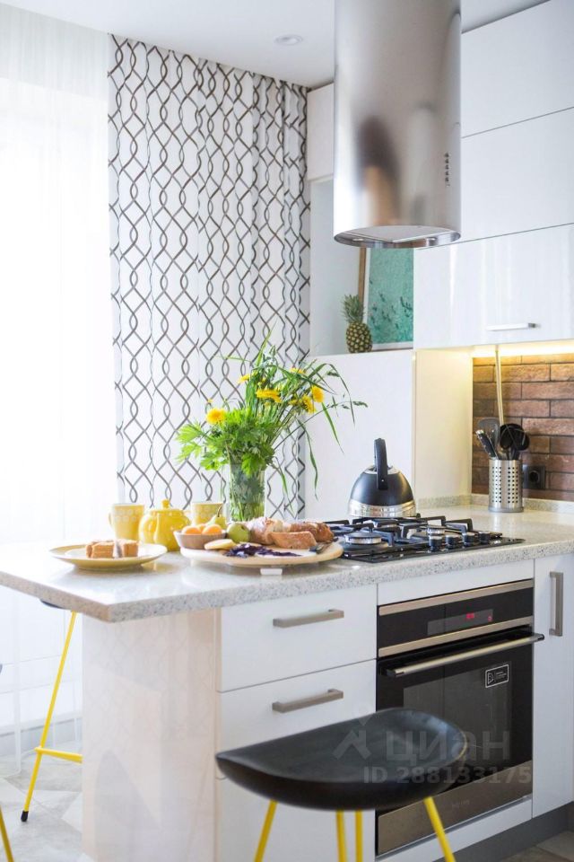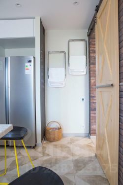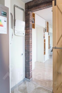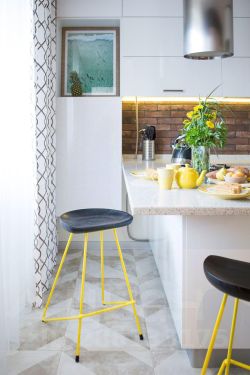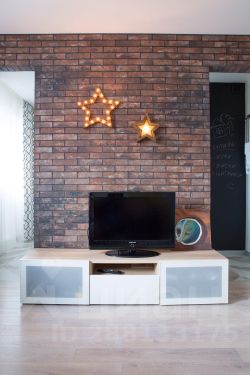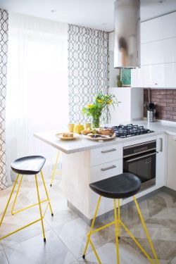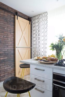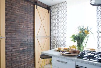 Центральная стена между гостиной и кухней облицована имитацией старого кирпича, мы оставили два дверных проема, чтобы передвижения в проходной гостиной были максимально комфортны, этот прием позволил визуально расширить оба помещения, в результате и кухня, и гостиная кажутся больше. А светлые "амбарные" двери со стороны кухни не только украшают своим необычным видом, но и позволяют закрыть пространство, если, например, ночуют гости.