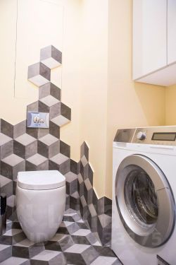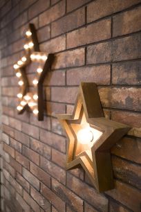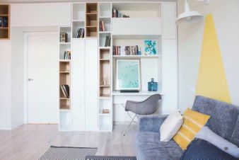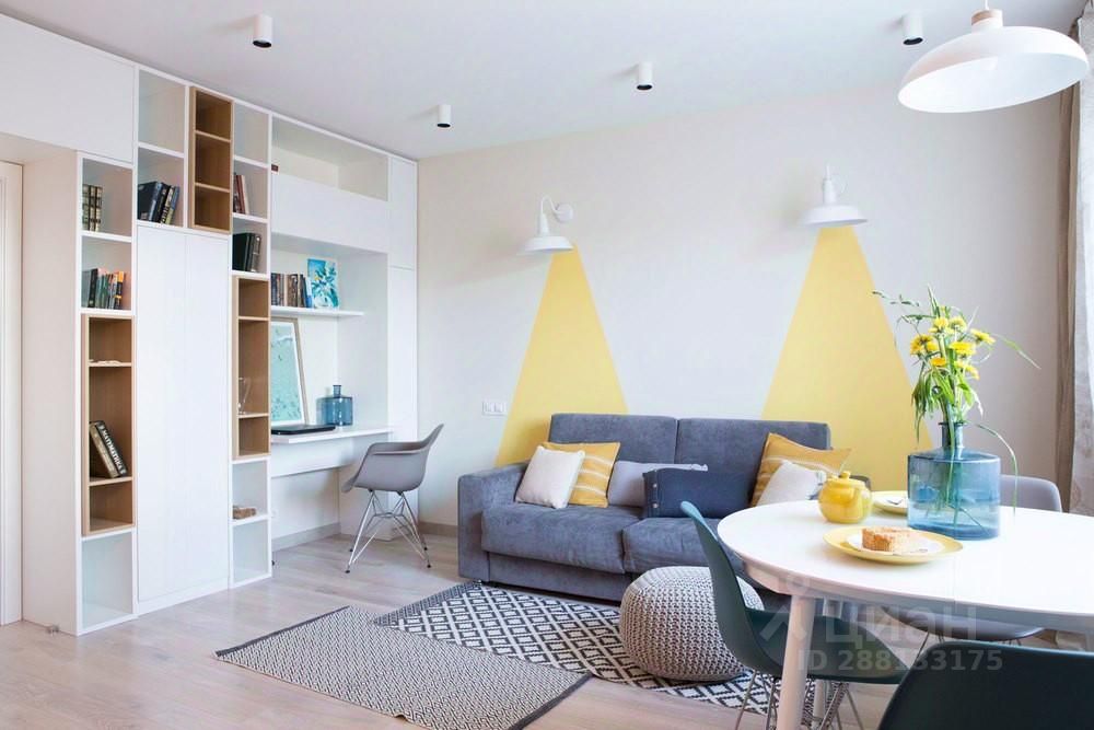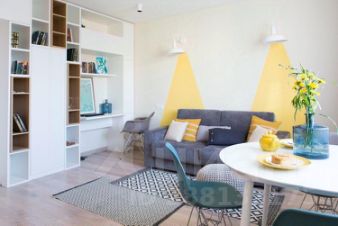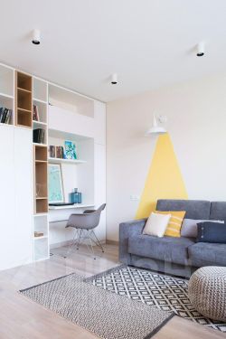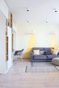 В гостиной мы сделали акцент на декоративных желтых лучах света на стене за диваном.