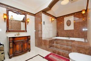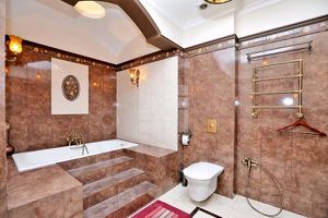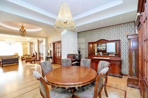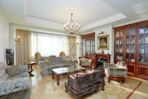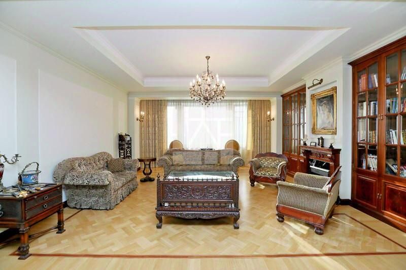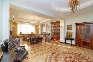 Отделка выполнена в классическом стиле с использованием дорогостоящих натуральных материалов. Эксклюзивные элементы отделки, такие как ковка и витражи придают квартире изысканности.