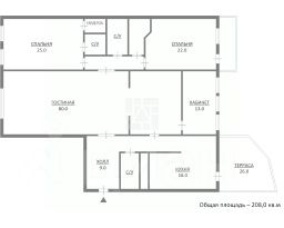 Функциональное планировочное решение включает в себя: гостиную с камином, столовую, библиотеку, кабинет (по желанию, можно переделать в спальню), кухню, зимний сад с водопадом, две спальни, гардеробную, лоджию, три санузла.