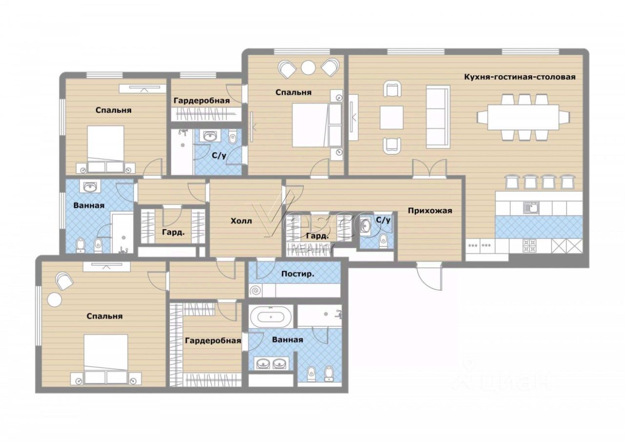 Функциональная планировка: просторная кухня-столовая-гостиная, 3 спальни со своими ванными и гардеробными комнатами, гостевой санузел, гардеробная, постирочная, холл.