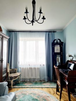 квартире 3 спальные комнаты, кухня - гостиная, гардеробная, два сан. узла, лоджия с теплым полом и зимним утеплением. Общая площадь квартиры 95.1 кв. м (без учета лоджии), фактически 106 кв. м. Комнаты: 19.3 - 12.2 - 19.9 - 14.1 кв.м. Прихожая -6.9 кв.м., темная комната-2.1 кв.м., кухня -11.7 кв.м., ванная комната -6.3 кв.м., туалетная комната -2.7 кв.м., коридор - 1.9 кв.м. Уютная, просторная квартира улучшенной планировки с хорошим микроклиматом, вентиляцией, сплит-системой. В квартире установлены магистральные фильтры очистки воды, на кухне дополнительно установлен качественный немецкий фильтр очистки питьевой воды. Стены выровнены, окрашены, штукатурка, полы дубовые без клея, плитка, двери из дерева, чугунные батареи в стиле прованс, встроенные вместительные шкафы для одежды.