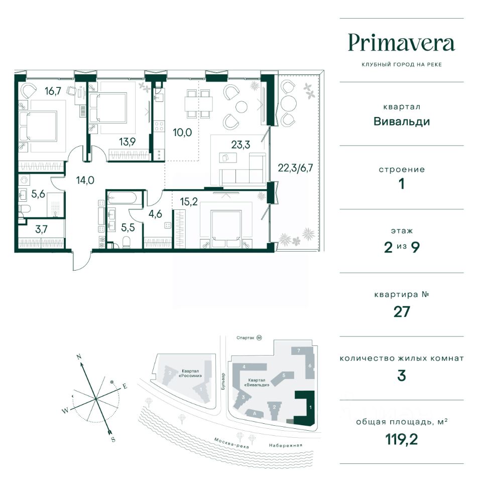 Клубный город на реке Primavera — это современный жилой комплекс премиум-класса, расположенный на первой береговой линии Москвы-реки в экологически чистом районе Покровское-Стрешнево. Под панорамными окнами квартир находится собственный экопарк с продуманной сетью прогулочных дорожек и современными детскими и спортивными площадками. За парком расположена набережная с собственным пляжем и зонами для отдыха. Клубный город на реке Primavera предлагает широкий выбор планировок для различных жизненных сценариев: от просторных однокомнатных квартир до пентхаусов и жилых помещений с террасами и патио. Выберите из 120 вариантов эргономичных планировок стандартного и евроформата. Из каждой квартиры открываются красивые виды на реку с углом обзора в 270 градусов. Дизайнерские лобби предлагают панорамный обзор на благоустроенный двор. Высокие потолки в 6 метров и качественная отделка создают атмосферу, схожую с пятизвездочными отелями. В Primavera есть всё необходимое для комфортной жизни в мегаполисе: • Образование для детей в шаговой доступности: 4 школы, 8 детских садов и развивающие центры с кружками и секциями. • Удобства на расстоянии приятной прогулки: супермаркеты, кафе, рестораны с верандами, салоны красоты, аптеки и многофункциональный центр для шоппинга и развлечений. • Умный дом: автоматизированное бесконтактное управление основными системами доступа и безопасности через мобильное приложение. Клубный город на реке Primavera выгодно сочетает комфорт городской жизни с близостью к природе. Живите в месте, где все создано для вашего удобства!