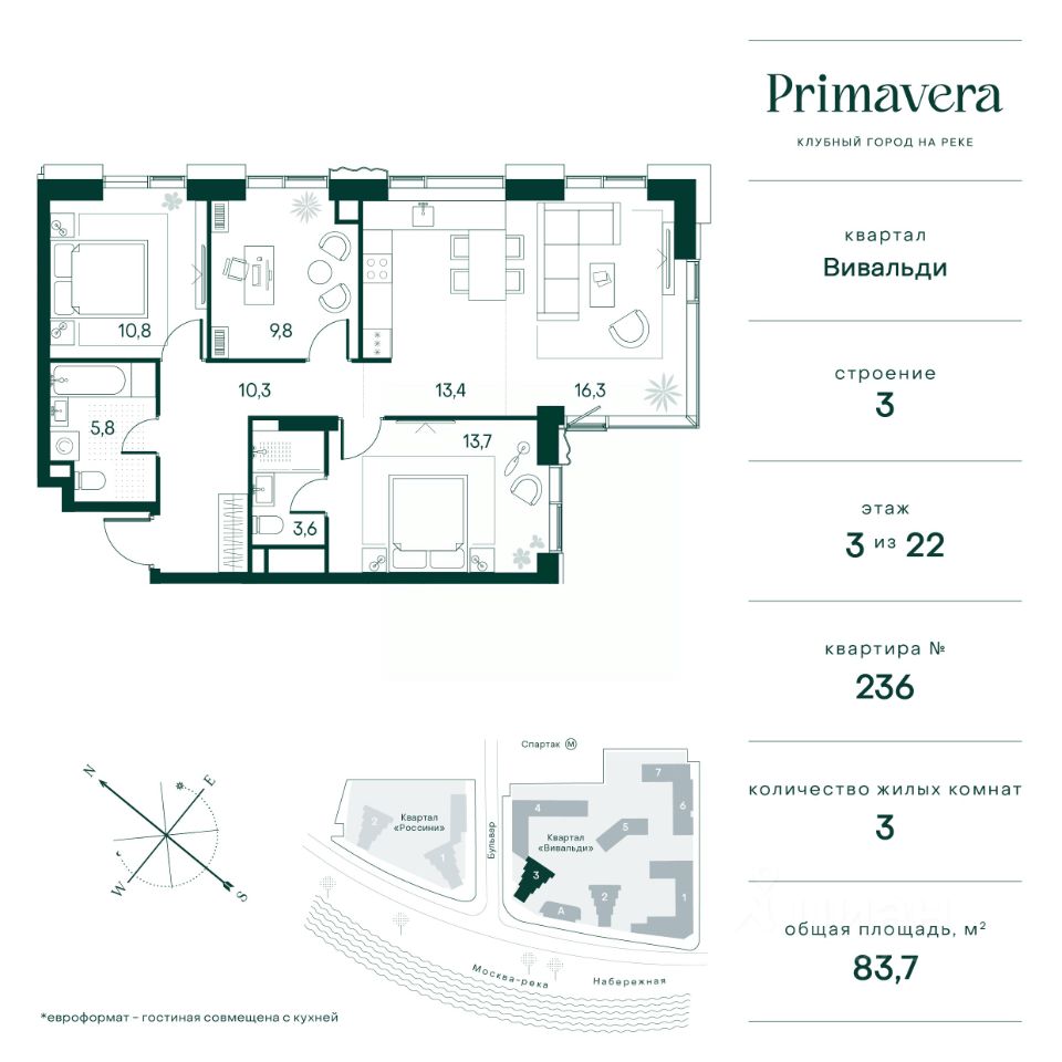 Клубный город на реке Primavera — это респектабельный проект премиум-класса на первой береговой линии Москвы-реки в экологически безупречном районе — Покровское-Стрешнево. Под панорамными окнами квартир расположился собственный экопарк, площадью 12 гектаров с сетью прогулочных дорожек, оборудованный детскими и спортивными площадками, а за ним набережная с собственным пляжем и зонами отдыха. Клубный город на реке Primavera предлагает впечатляющий выбор планировок для любого жизненного сценария: от просторных однокомнатных квартир до пентхаусов и квартир с видовыми террасами или патио. Выбирайте из 120 вариантов эргономичных планировок стандартного и евроформата. В проекте доступны квартиры площадью от 40 до 209 м², в каждой из которых открываются непревзойденные виды на реку, а угол обзора составляет 270 градусов. Из дизайнерских лобби открывается панорамный обзор на зеленый благоустроенный двор. Статусное мебелирование, потолки высотой 6 м и комфортная лаунж-зона отсылают к стилистике высококлассных пятизвездочных отелей. В Primavera есть все, что может предложить мегаполис, здесь все сосредоточено вокруг вас и настроено на ваши желания: - Всестороннее детское развитие в паре шагов от дома: 4 школы, 8 детских садов, развивающие центры с кружками и секциями. - Комфорт мегаполиса на расстоянии приятной прогулки: супермаркеты, кафе, рестораны с верандами на крыше, салоны красоты, аптеки, компании сферы услуг, многофункциональный центр для шоппинга и развлечений. - Умный дом: автоматизированное бесконтактное управление основными системами доступа, инфраструктуры и безопасности через мобильное приложение и специальные метки. Клубный город на реке Primavera выгодно отличается близостью к природе, совмещенной с насыщенной инфраструктурой.