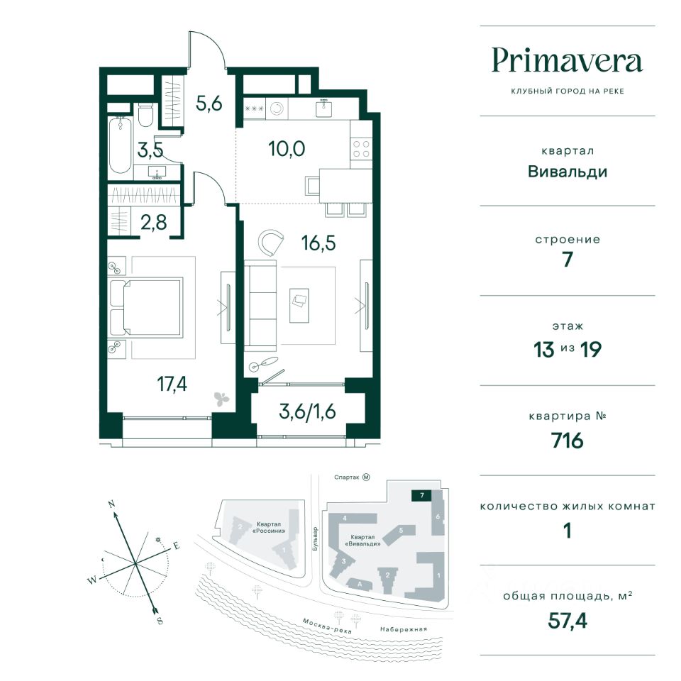 Клубный город на реке Primavera — это современный жилой комплекс премиум-класса, расположенный на первой береговой линии Москвы-реки в экологически чистом районе Покровское-Стрешнево. Под панорамными окнами квартир находится собственный экопарк с продуманной сетью прогулочных дорожек и современными детскими и спортивными площадками. За парком расположена набережная с собственным пляжем и зонами для отдыха. Клубный город на реке Primavera предлагает широкий выбор планировок для различных жизненных сценариев: от просторных однокомнатных квартир до пентхаусов и жилых помещений с террасами и патио. Выберите из 120 вариантов эргономичных планировок стандартного и евроформата. Из каждой квартиры открываются красивые виды на реку с углом обзора в 270 градусов. Дизайнерские лобби предлагают панорамный обзор на благоустроенный двор. Высокие потолки в 6 метров и качественная отделка создают атмосферу, схожую с пятизвездочными отелями. В Primavera есть всё необходимое для комфортной жизни в мегаполисе: • Образование для детей в шаговой доступности: 4 школы, 8 детских садов и развивающие центры с кружками и секциями. • Удобства на расстоянии приятной прогулки: супермаркеты, кафе, рестораны с верандами, салоны красоты, аптеки и многофункциональный центр для шоппинга и развлечений. • Умный дом: автоматизированное бесконтактное управление основными системами доступа и безопасности через мобильное приложение. Клубный город на реке Primavera выгодно сочетает комфорт городской жизни с близостью к природе. Живите в месте, где все создано для вашего удобства!