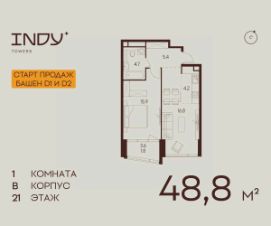 Продается уютная однокомнатная квартира на 21 этаже жилого комплекса Indy Towers. Вид из окон: во двор. Срок сдачи: 4 кв. 2026 г.