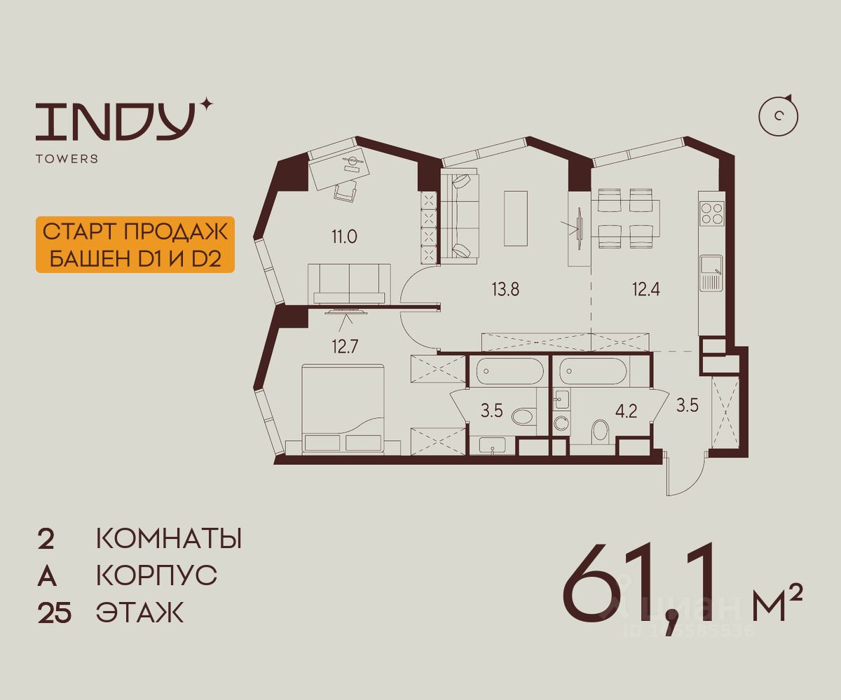 Продается просторная 2-комнатная квартира на 25 этаже жилого комплекса Indy Towers. Вид из окон: на улицу и двор. Срок сдачи: 4 кв. 2026 г.