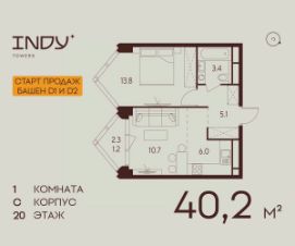 Продается уютная однокомнатная квартира на 20 этаже жилого комплекса Indy Towers. Вид из окон: во двор. Срок сдачи: 4 кв. 2026 г.