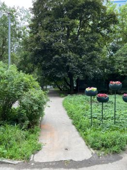 Все окна выходят в тихий двор насыщенный зеленью. Ни дорог, ни строек, ни шума.