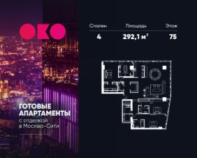К продаже предлагается уникальный 4-х комнатный видовой апартамент от застройщика площадью 292,1 кв.м, расположенный на 75 этаже знакового небоскреба Око. Идеальный лот для большой семьи, а также для ценителей личного пространства и масштаба, полностью готов к проживанию, ключи передаются в день покупки. Все 3 спальные комнаты (29,2 кв.м, 27,4 кв.м и 28,9 кв.м) имеют собственные гардеробные и ванные. Отличительной особенностью данного апартамента является зона master-bedroom (главной спальни), органично отделенная от общественного пространства и имеющая собственную ванную комнату с панорамным окном площадью 18,2 кв.м, а также большую гардеробную, что создает приватность и комфорт проживания. В санузлах установлена премиальная сантехника Fantini. Высококачественные отделочные материалы с использованием природного камня, полы из натурального дерева. Залитая светом кухня-гостиная площадью 113,1 кв.м укомплектована итальянским кухонным гарнитуром Rifra и техникой Kuppersbusch.