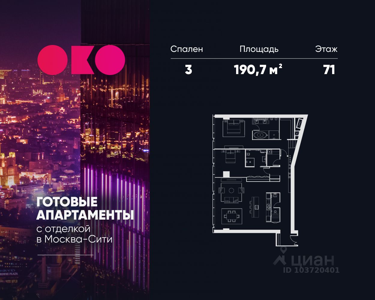 К продаже предлагается шикарный 3-х комнатный видовой апартамент от застройщика площадью 190,7 кв.м, расположенный на 71 этаже знакового небоскреба ОКО. Апартамент идеально подходит для большой семьи и полностью готов к проживанию, ключи передаются в день покупки. Отличительной особенностью данного апартамента является зона master-bedroom (главной спальни) площадью 34,1 кв.м, органично отделенная от общественного пространства и имеющая собственную ванную комнату площадью 11,8 кв.м, а также большую гардеробную, что создает приватность и комфорт проживания. Вторая спальная комната площадью 24,6 кв.м оборудована собственным санузлом с душевой кабиной. В санузлах установлена премиальная сантехника Fantini. Высококачественные отделочные материалы с использованием природного камня, полы из натурального дерева. Залитая светом, просторная кухня-гостиная площадью 62,6 кв.м укомплектована итальянским кухонным гарнитуром Rifra и техникой Kuppersbusch.