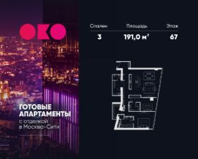 К продаже предлагается шикарный 3-х комнатный видовой апартамент от застройщика площадью 191 кв.м, расположенный на 67 этаже знакового небоскреба ОКО. Апартамент идеально подходит для большой семьи и полностью готов к проживанию, ключи передаются в день покупки. Отличительной особенностью данного апартамента является зона master-bedroom (главной спальни) площадью 36,1 кв.м, органично отделенная от общественного пространства и имеющая собственную ванную комнату площадью 12 кв. м, а также большую гардеробную, что создает приватность и комфорт проживания. Вторая спальная комната площадью 20,7 кв.м оборудована собственным санузлом с душевой кабиной. В санузлах установлена премиальная сантехника Fantini. Высококачественные отделочные материалы с использованием природного камня, полы из натурального дерева. Залитая светом, просторная кухня-гостиная площадью 66,5 кв.м укомплектована итальянским кухонным гарнитуром Rifra и техникой Kuppersbusch.