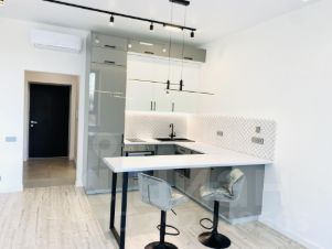 На фотографиях приведены фотографии уже готовой аналогичной квартиры по тому же проекту. По умолчанию отделка будет точно такой же. При желании можно изменить цвета плитки в санузле, цвет стен, цвет фасада кухни. Все обсуждается. Учтем все Ваши пожелания.