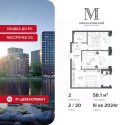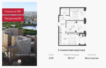 Продаётся 2-к квартира 58,1 кв.м. в ЖК "Михалковский" на 2-м этаже 20 этажного дома.
