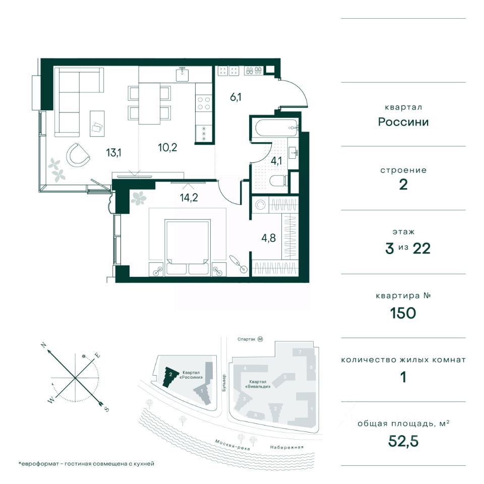 Общая площадь52,5 м²