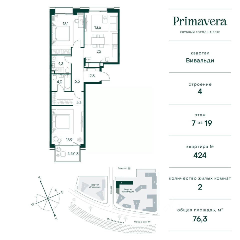 Клубный город на реке Primavera — это современный жилой комплекс премиум-класса, расположенный на первой береговой линии Москвы-реки в экологически чистом районе Покровское-Стрешнево. Под панорамными окнами квартир находится собственный экопарк с продуманной сетью прогулочных дорожек и современными детскими и спортивными площадками. За парком расположена набережная с собственным пляжем и зонами для отдыха. Клубный город на реке Primavera предлагает широкий выбор планировок для различных жизненных сценариев: от просторных однокомнатных квартир до пентхаусов и жилых помещений с террасами и патио. Выберите из 120 вариантов эргономичных планировок стандартного и евроформата. Из каждой квартиры открываются красивые виды на реку с углом обзора в 270 градусов. Дизайнерские лобби предлагают панорамный обзор на благоустроенный двор. Высокие потолки в 6 метров и качественная отделка создают атмосферу, схожую с пятизвездочными отелями. В Primavera есть всё необходимое для комфортной жизни в мегаполисе: • Образование для детей в шаговой доступности: 4 школы, 8 детских садов и развивающие центры с кружками и секциями. • Удобства на расстоянии приятной прогулки: супермаркеты, кафе, рестораны с верандами, салоны красоты, аптеки и многофункциональный центр для шоппинга и развлечений. • Умный дом: автоматизированное бесконтактное управление основными системами доступа и безопасности через мобильное приложение. Клубный город на реке Primavera выгодно сочетает комфорт городской жизни с близостью к природе. Живите в месте, где все создано для вашего удобства!