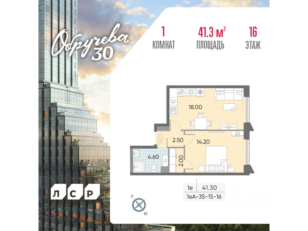 Продается 1-комнатная квартира общей площадью 41.3 кв. метров на 16 этаже дома бизнес-класса "Обручева 30". Дом располагается в 5 минутах ходьбы до станции метро "Калужская" и 10 минутах до станции метро "Воронцовская". Для автомобилистов удобный и быстрый выезд на улицы Обручева и Профсоюзную.