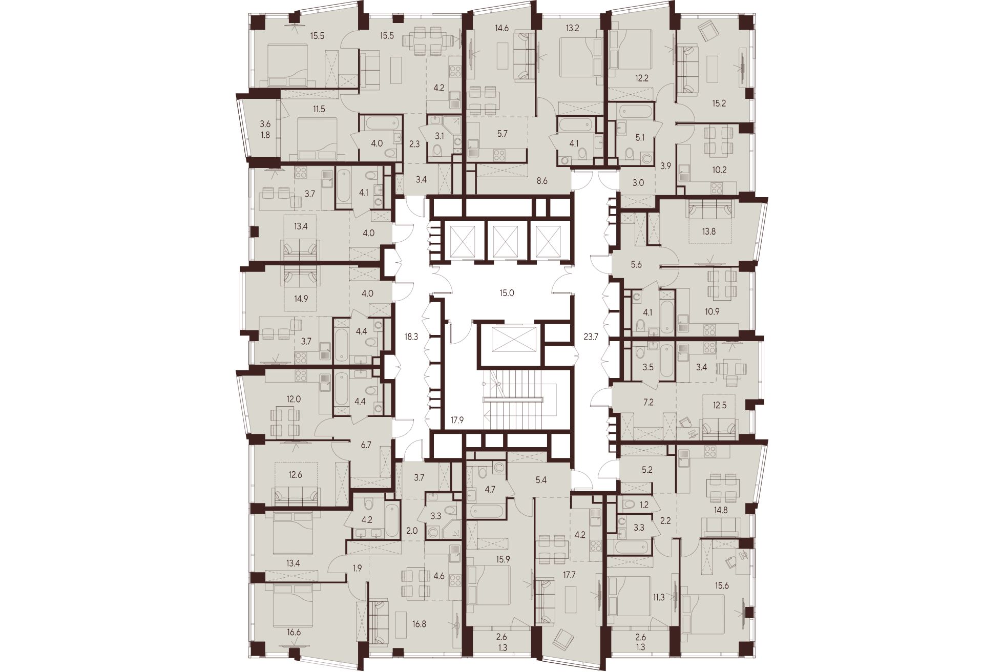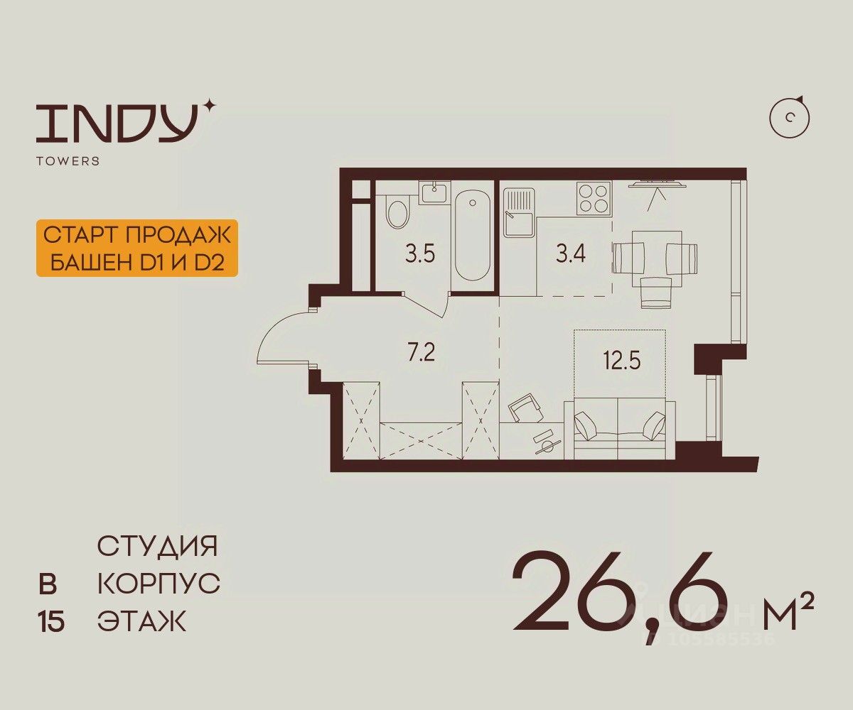 Продается просторная студия на 15 этаже жилого комплекса Indy Towers. Вид из окон: во двор. Срок сдачи: 4 кв. 2026 г.